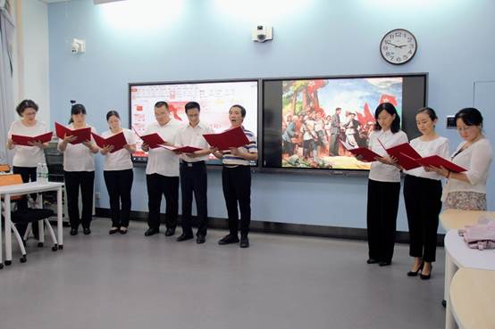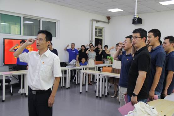 活动第三项,重温入党誓词。全体党员起立,面向鲜红的党旗,高举右拳,庄严宣誓。