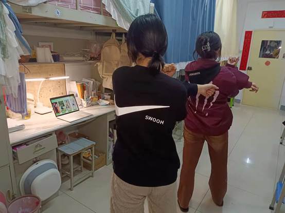 接着,王老师给同学们讲述了几种缓解压力的方法:与同学们一起倾听轻音乐、观看解压视频,同时带领同学们进行身体拉伸,缓解疲劳,释放压力。