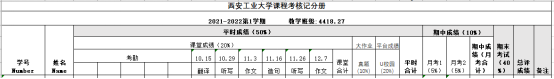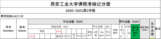 过程性评价成绩=课堂成绩×20%+Fif月考1×5%+Fif月考2×5%+U校园×20%+大作业×10%