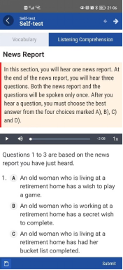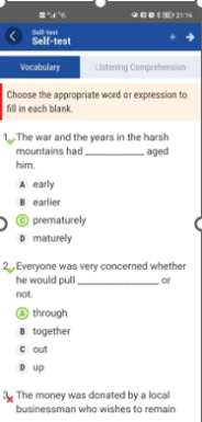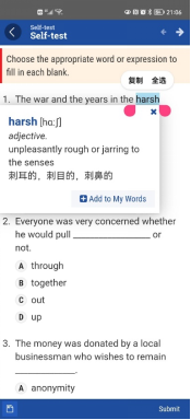 通过Welearn平台,每个单元移动端独享的词汇练习和“四级题型测试(self-test)”,有查词、有答案,抑制了学生的畏难情绪,促使他们实现了课后自主练习,还可以感受随时提交、即时反馈的体验。如图2所示: