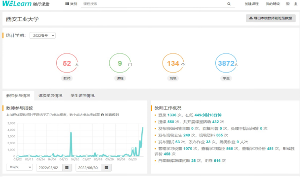 一方面,学校系统管理员可通过特定端口查看所有数据,包括使用平台的师生数量、教师工作的详细统计,教师行为、师生互动等,便于监管部门的及时反馈与调整。依次为U校园,Welearn和Fif口语平台,如图8所示: