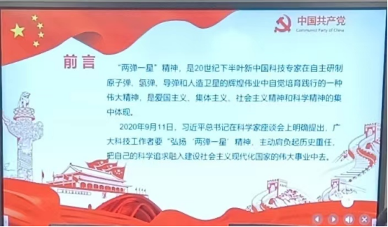 在交流研讨环节,图学与信息党支部的孙晓燕同志带领大家学习了“两弹一星”精神,生动讲解了“两弹一星”精神的产生背景、基本内涵及新时代“两弹一星”精神的传承弘扬。大家纷纷表示,要将"两弹一星"精神传承好,扎根人才培养主责主业,在平凡的岗位上取得优异成绩!