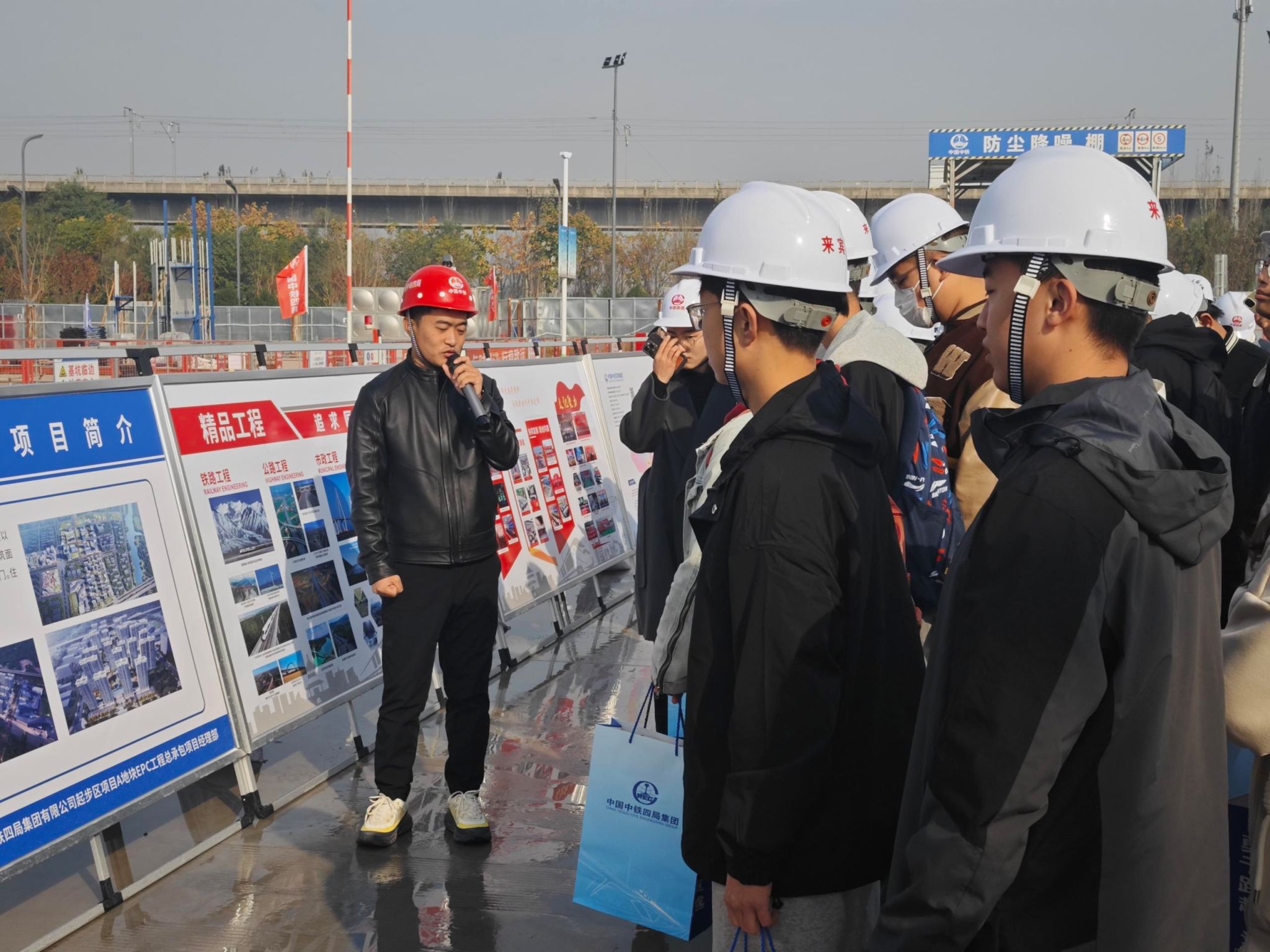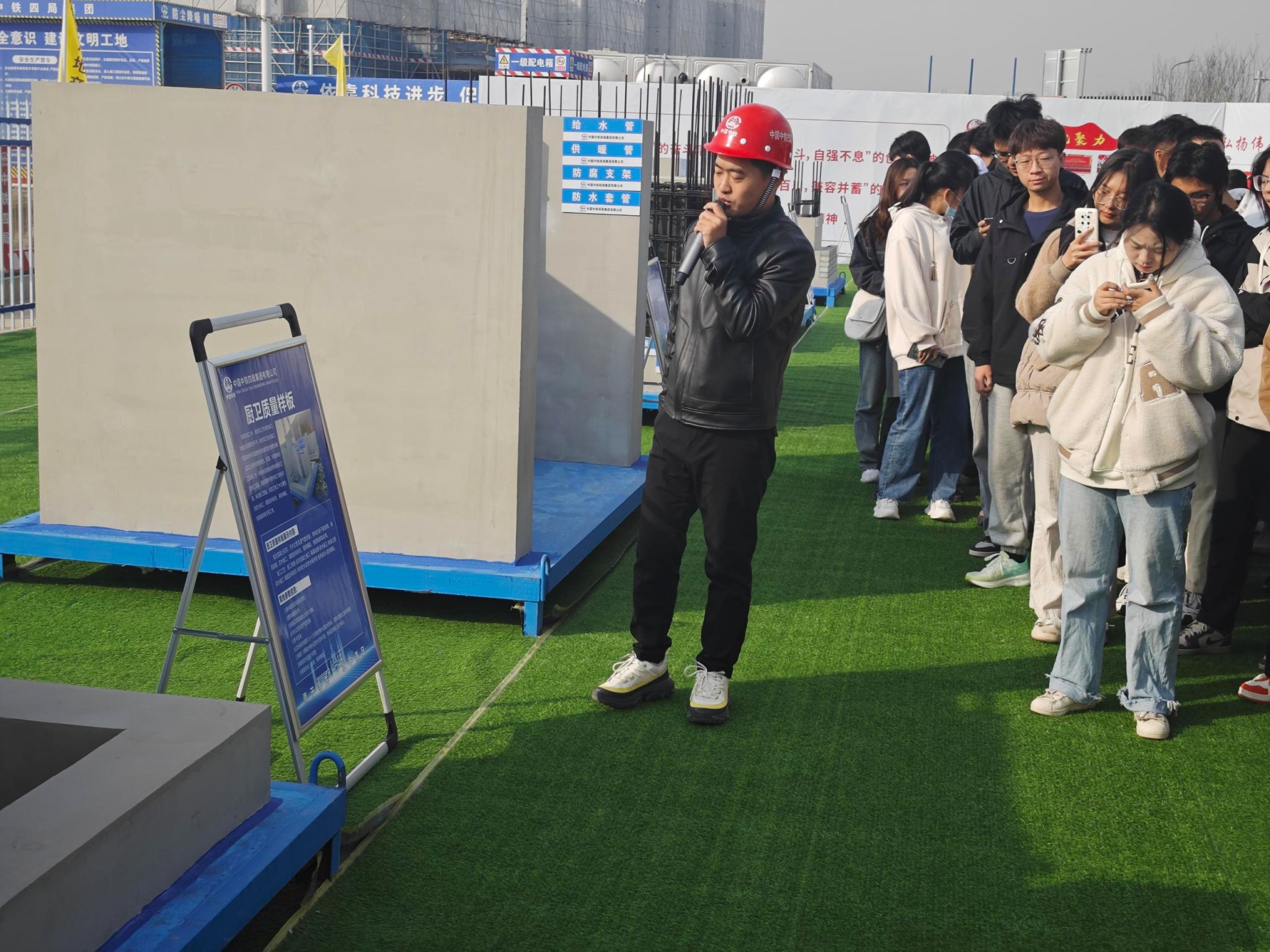 活动伊始,中铁四局六公司起步区A地块APC工程技术负责人刘赟为大家讲述了项目概况、工程布局、施工进度、工地突发状况处置等内容。随后带领全体同学进工地参观,讲解了铝膜主体结构、电气预埋及管道安装、厨卫地下室等质量样板,现场观摩了建筑主体支架和墙板模板支撑,刘赟鼓励大家珍惜大学光阴,学好专业课程和软件建模。此外,商务部技术主管王静静还为大家讲述了中铁四局的无码流出和发展历程。