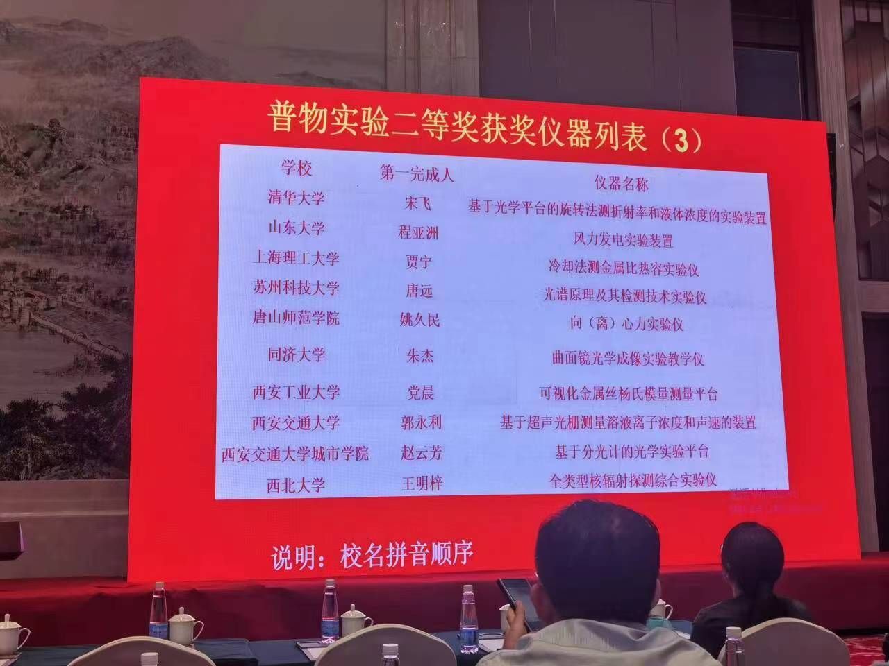 党晨老师自制仪器 “可视化金属丝杨氏模量测量平台” 获全国二等奖。该仪器基于光干涉原理测量材料的应变,使用机器视觉方法测量应力的变化,使微观现象更具可视化,该平台基于传统大学物理实验设计搭建,学生利用该平台实验可进行探索性研究。