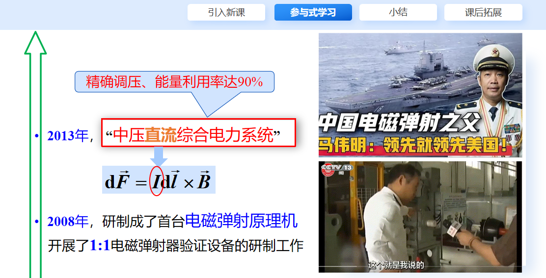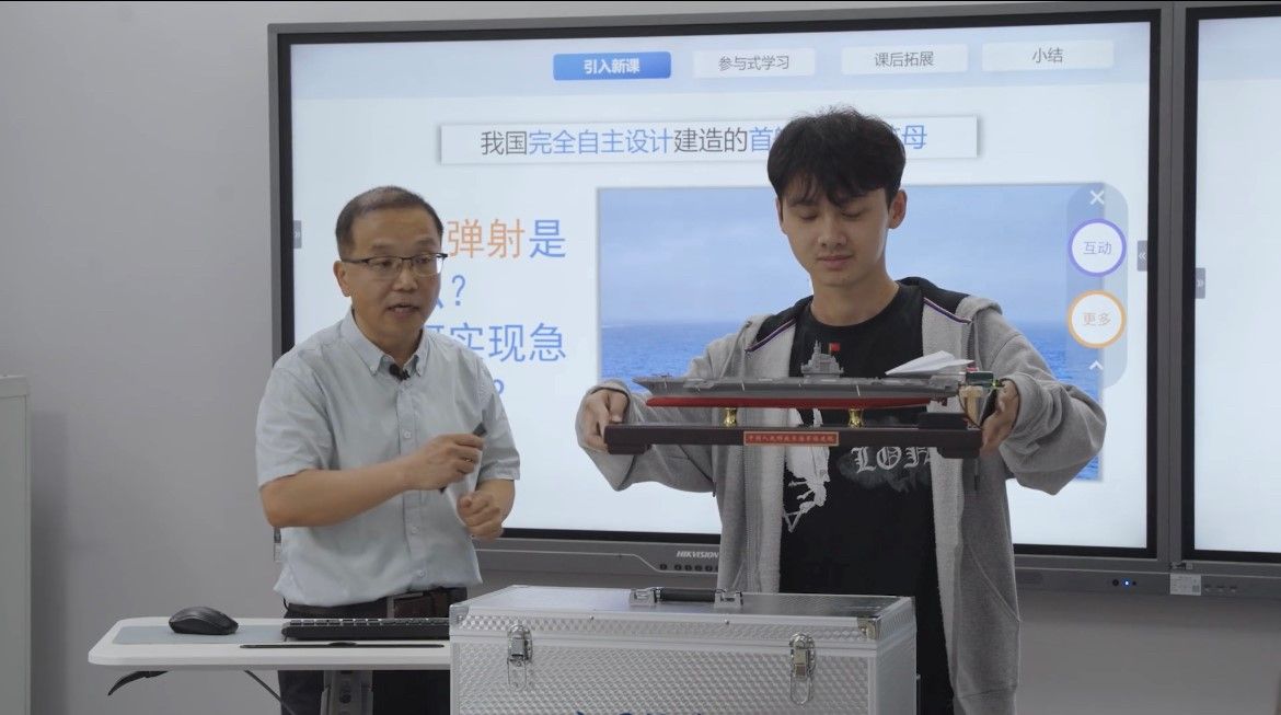 物理系肖宏波老师在物理教学中,巧妙地将科技强国、拼搏奉献的爱国精神融入教学实践,并充分利用智慧屏的直观展示、交互式虚拟仿真的沉浸式体验、AI助教的智能辅助以及实物教具的直观感受,构建起一个多维度、全方位的学习环境。例如在《安培力》一节中,以我国航母福建舰电磁弹射为例,启发学生思考电磁弹射技术的基本原理,在航母建设情景案例教学中引导学生深刻感受兵工学子自豪感与使命感,激励他们为国家的科技进步与国防建设贡献青春力量。