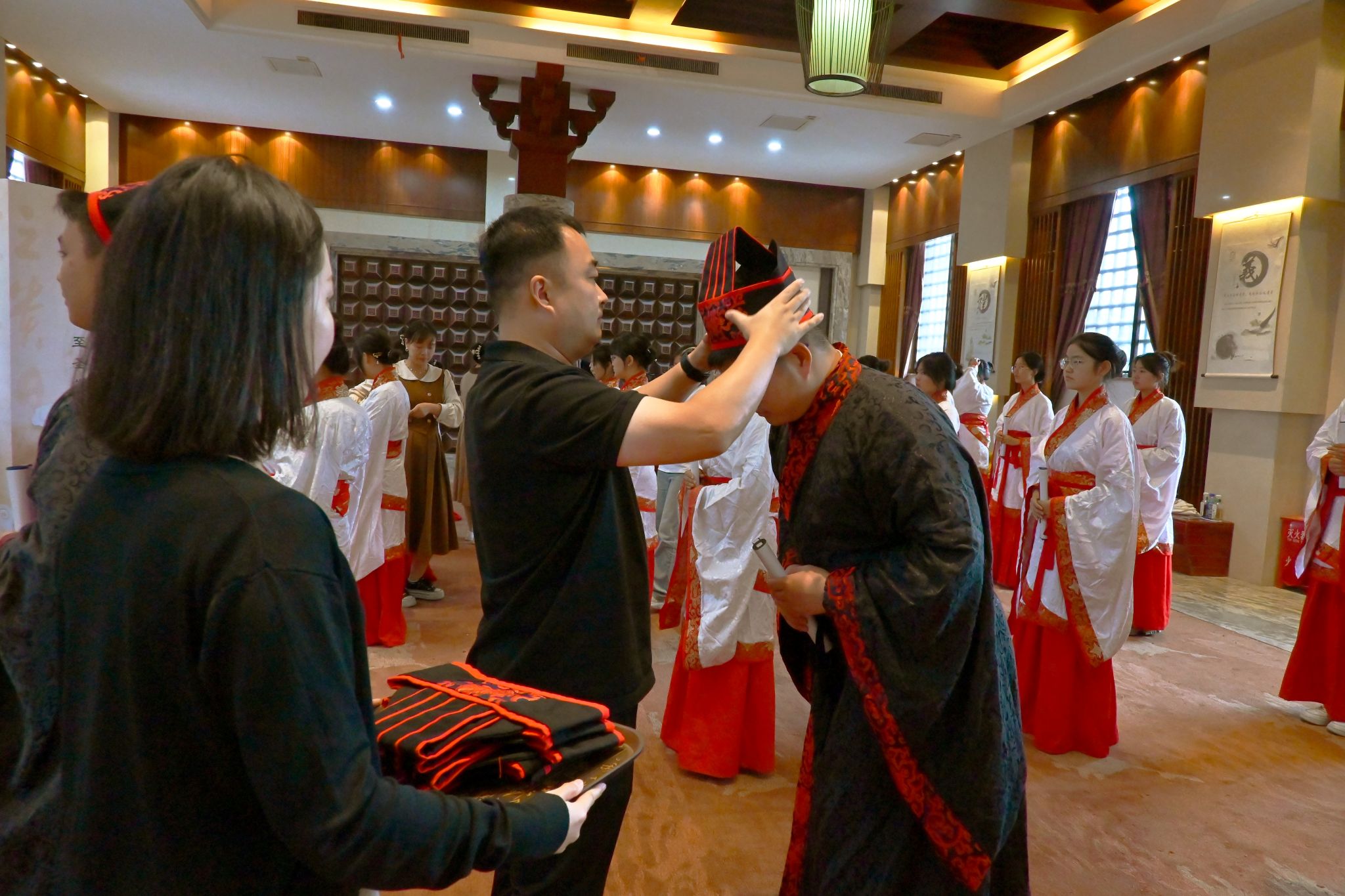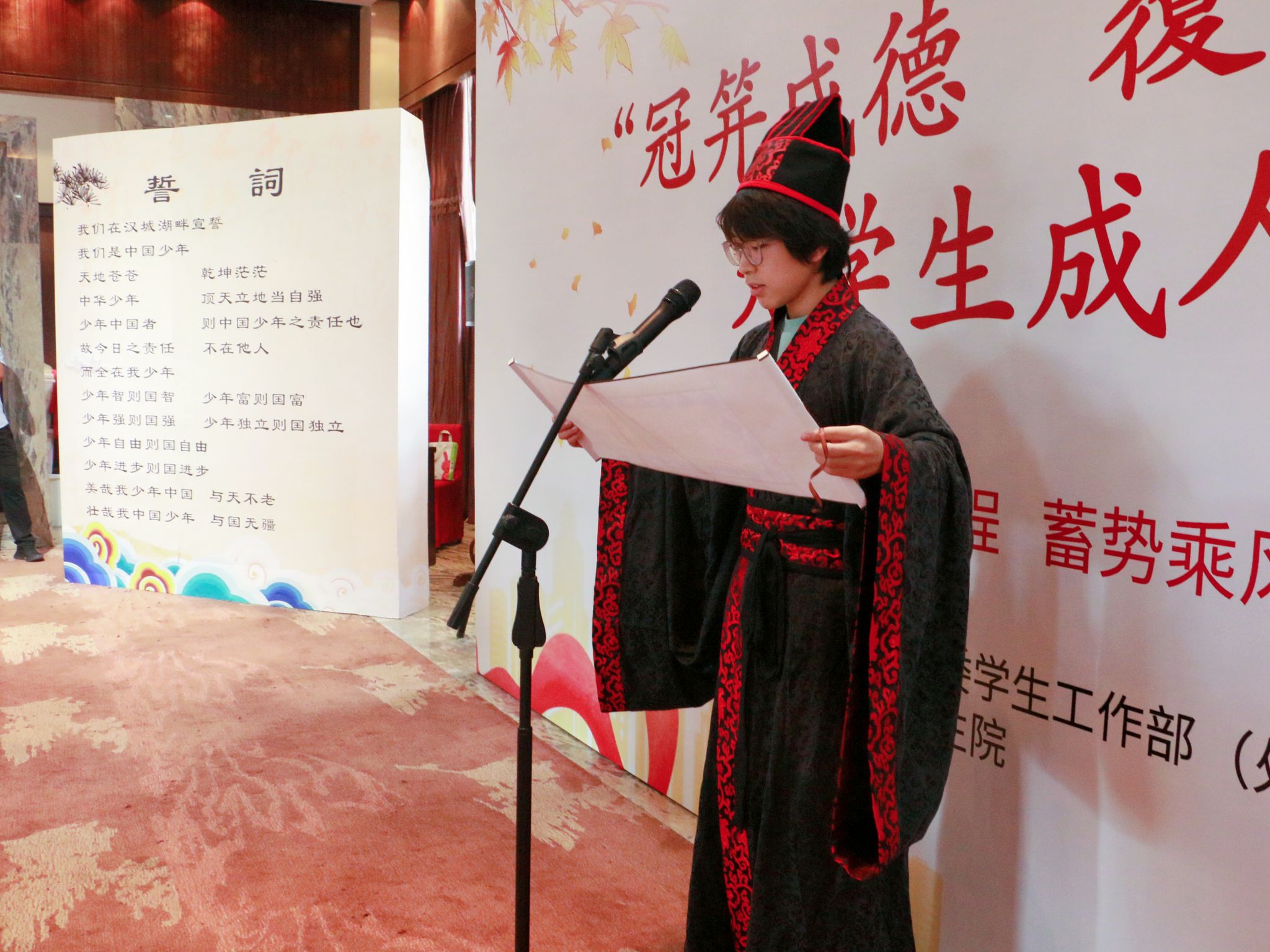 在仪式主赞礼的引导下,学生伴着礼乐,身着传统汉服入场。师长依次为学子加冠、加笄,见证学子们正式迈入成人行列。学子集体向师长行感恩礼,感谢师长教诲之恩。