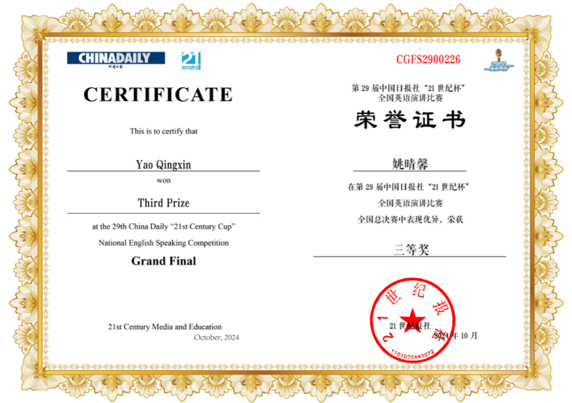 10月17日至10月21日,由中国日报社、21世纪英语教育传媒承办的第29届中国日报社“21世纪杯”全国大学生英语演讲比赛全国赛在无锡落下帷幕。我校2023级姚晴馨同学获得全国三等奖,实现我校在该竞赛获奖级别的历史性突破。