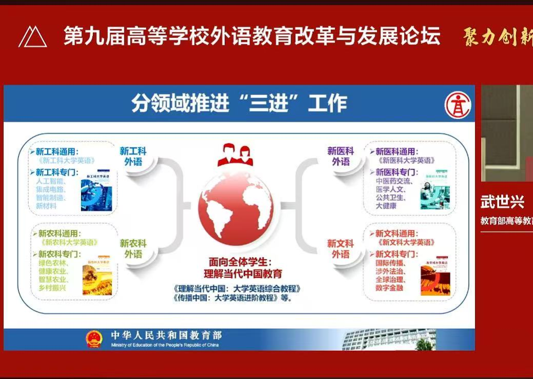 本次论坛包含主旨报告和专题论坛,聚焦提高外语人才自主培养质量、大学英语教材建设探索与实践、人工智能赋能高等外语教育发展和跨学科国际化人才培养等话题。在为期两天的论坛中,公共外语系全体教师认真观看了论坛直播,并特别关注聆听了智能驱动的高校外语教学生态重塑,服务国家战略的大学英语课程建设,数智赋能的“三进”教育模式创新、大学英语服务“四新能力”的再提升等专题报告。