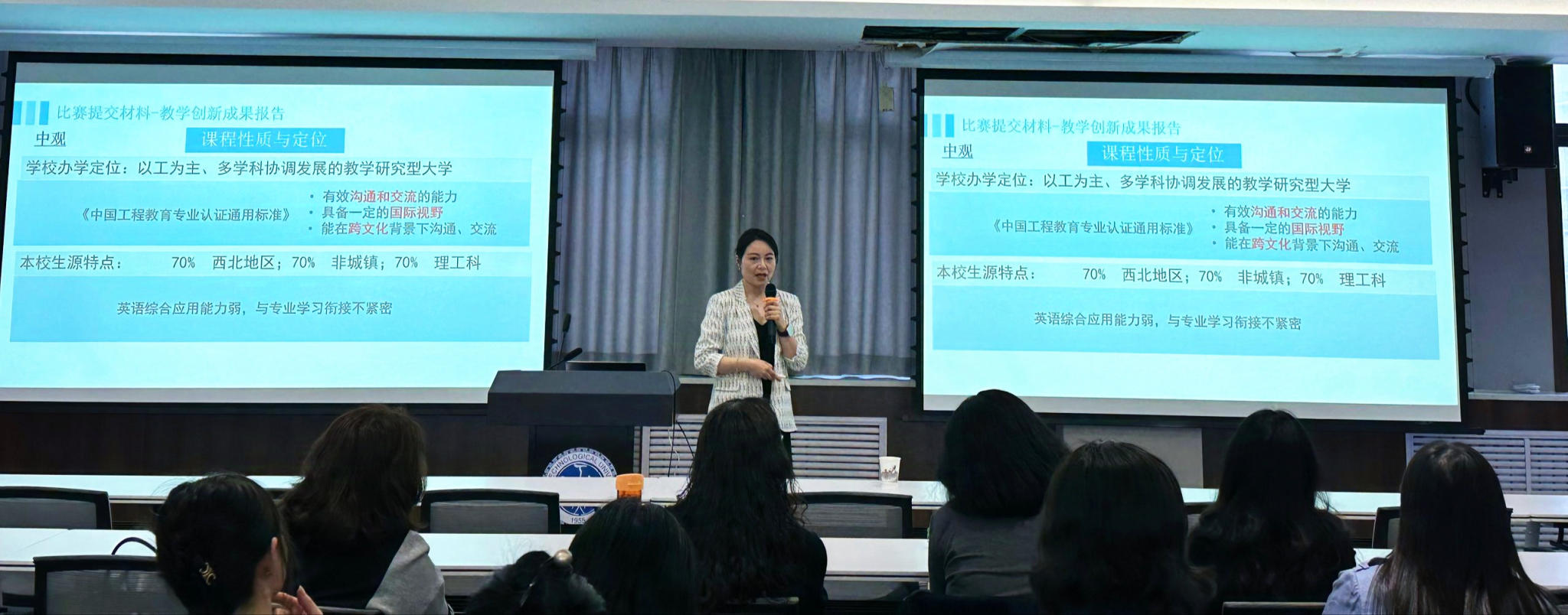 张玲老师在教学领域成果丰硕,曾获得首届全国高校教师教学创新大赛二等奖,陕西省首届高校课堂教学创新大赛一等奖,“外教社”陕西省大学英语教学比赛一等奖等,并多次担任全国高校教师创新大赛陕西赛区指导培训师。在此次分享会上,张老师从参赛者和评委两个角度深入浅出地介绍了教学创新大赛的背景、详细要求以及显著特点。她聚焦创新大赛材料准备环节,深入剖析关键要点。她指出,从课程简介、学情分析,到教学目标的设定与教学理念的阐述,每一个环节都需精准把握、丝丝入扣。尤其强调要深入梳理大学英语教学现存的痛点,结合本校实际情况,探索具有本校特色的大学英语教学模式,从而有针对性的深度挖掘。教学方法的选用、教学材料的筛选以及教学过程的设计,都应紧密围绕这些痛点与本校特色,构建起高效且独特的教学体系。张教授的这些见解,为我校教师参与创新教学大赛提供了极具实操性的建议。