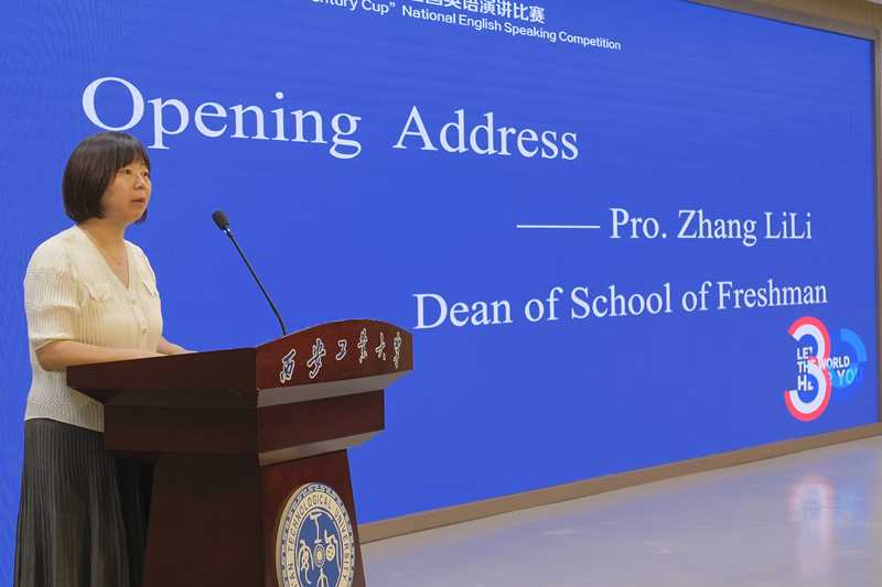 在这项赛事中取得的成绩并对选手们提出殷切希望。同时也期望该比赛为我校学生搭建用英语展现自我、传播中国声音的舞台,期待同学们以语言为桥,展中国青年之思;以思想为帆,传华夏文明之声。
