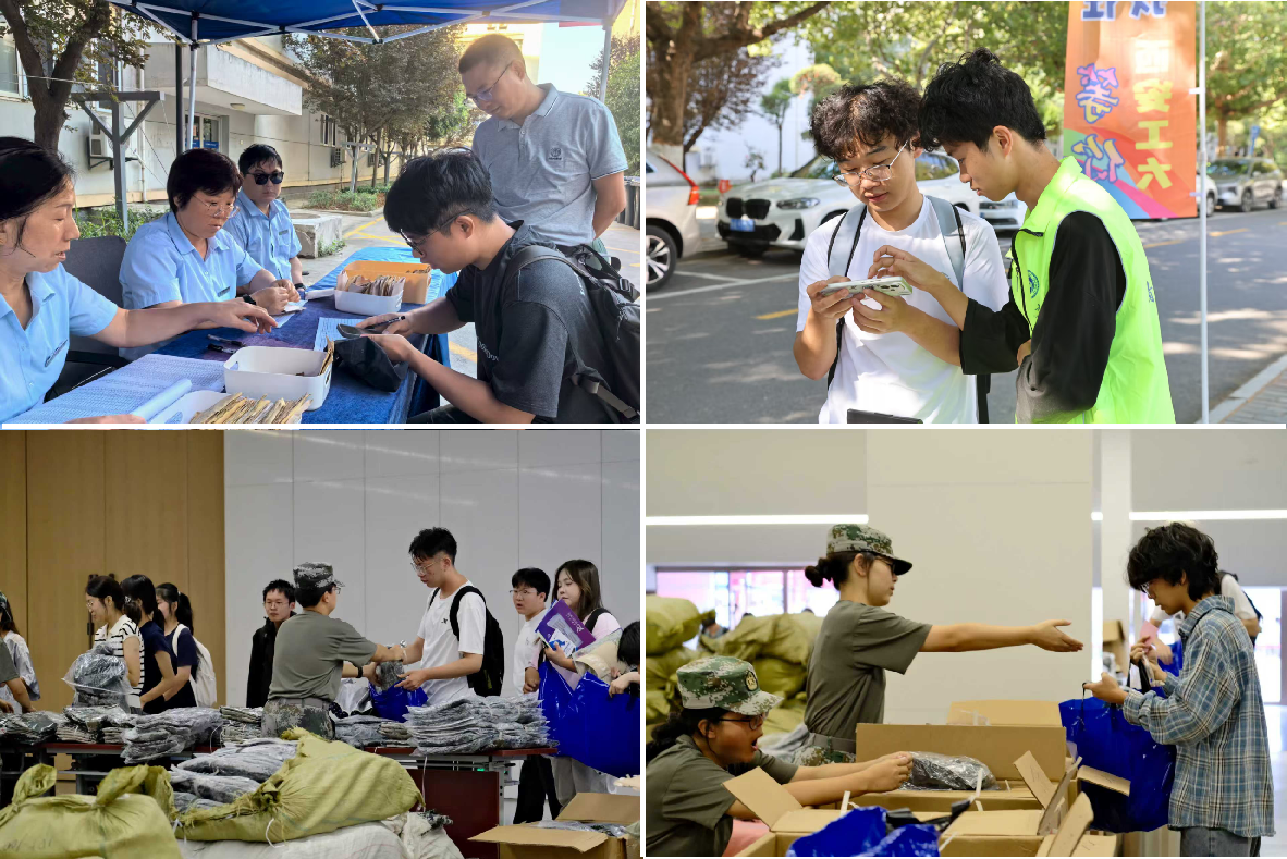 新生在工作人员和志愿者的热情帮助下领取军训服、被褥等,妥善安置行李。校园里志愿者、爱校卫士穿梭忙碌,成为最动人的迎新风景。
