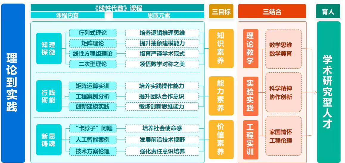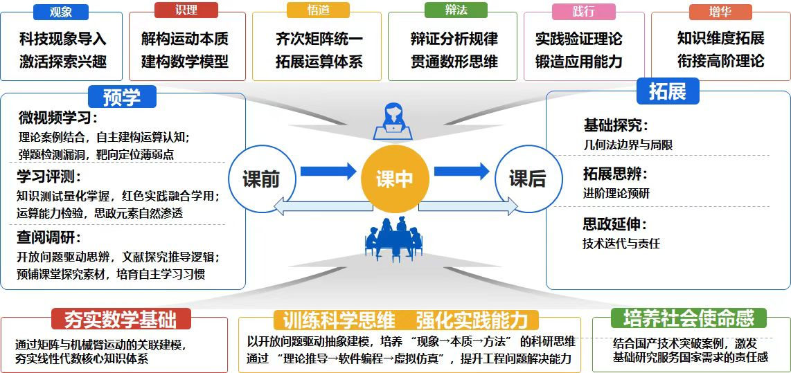 数学系《线性代数》课程思政示范团队,从“知理探微、行践砺能、新思铸魂“三个维度有机融入”数学思维、数学美育、科学精神、协作创新、家国情怀、工程伦理“六大思政主题,形成三目标三结合的课程思政育人模式。例如在矩阵的运算这一知识点中,以春晚 BOT 舞蹈这一科技文化融合场景为切入点,将矩阵运算、坐标变换等知识转化为机械臂运动控制的工程问题,实现从生活现象到工程问题再到数学原理的认知闭环,构建知识传授与价值塑造的精准映射,激发学生以知识服务国家战略的责任感,培养学生探索未知的勇气以及严谨治学的意识。