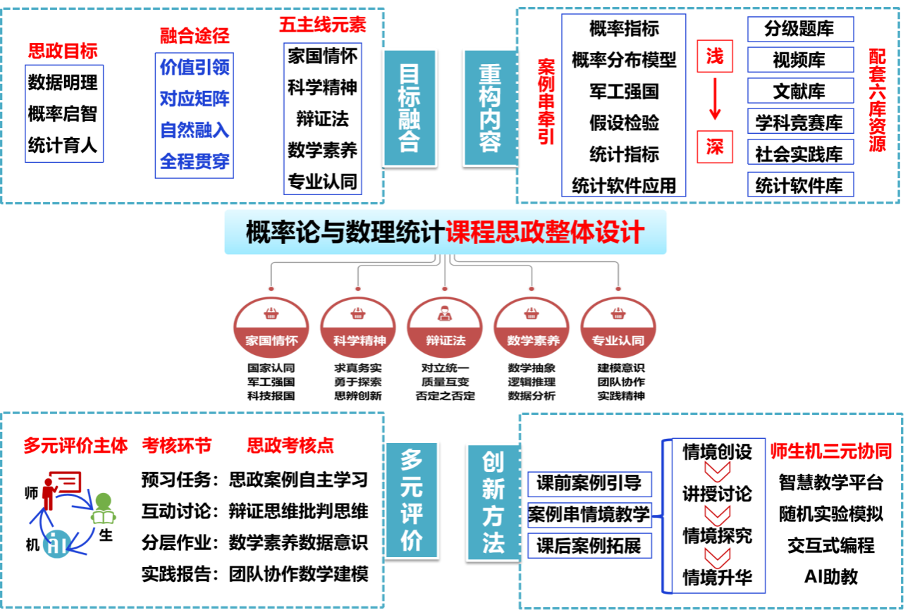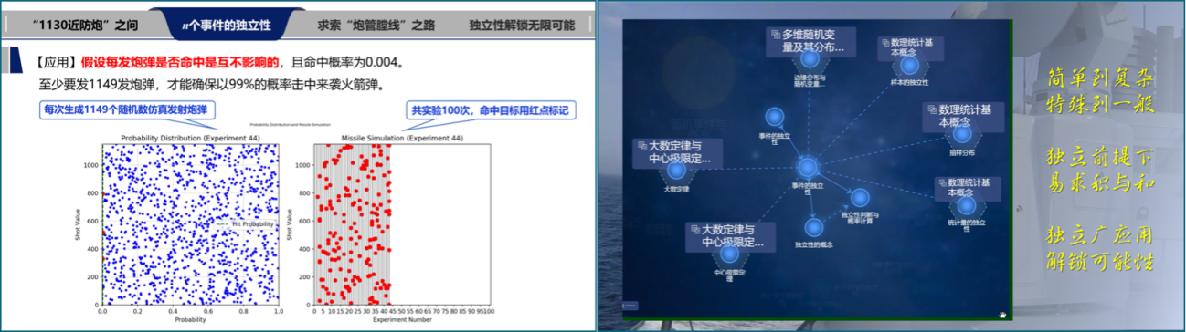 数学系《概率论与数理统计》课程思政示范团队,设定“数据明理、概率启智、统计育人”的课程目标,沿“家国情怀、科学精神、辩证法、数学素养、专业认同”五大主线,深挖课程思政元素,通过“目标融合→重构内容→创新方法→多元评价”的系统化路径,实现概率统计理论与思政育人的深度融合。如在“独立性”教学中,设计“近防炮拦截来袭导弹命中率”“系统可靠性分析”等由浅入深的课程思政案例串,并借助AI助教、交互式数据模拟程序等新手段,提升学生数学建模与数据分析处理的能力。同时,使学生了解我校科研团队在解决国防重大装备卡脖子技术难题时所发挥的作用,增强了学生爱校荣校的使命感,和军工强国、科技报国的责任担当。