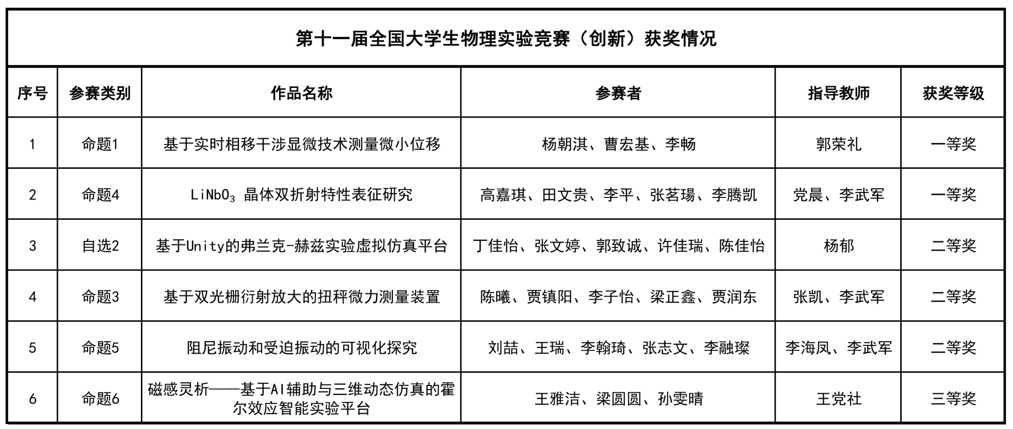 2025年第十一届全国大学生物理实验竞赛(创新)于11月23日在湖南长沙正式落下帷幕,来自全国722所高校的3260项作品参赛,我校参赛队伍历经校赛、西北地区竞赛层层选拔,前后历时近8个月,最终所推荐的6支参赛队伍斩获全国一等奖2项;二等奖3项,三等奖1项,我校获得优秀组织奖。