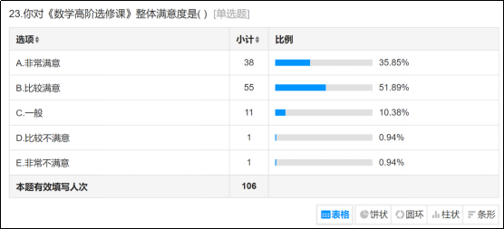 二是以服务学生考研需求为目标,面向大二、大三学生开设《数学高阶选修课》。分为春季基础课程、暑期强化训练、秋季冲刺课程三个连续阶段,有力提升学生考研数学成绩。所发放的调查问卷结果显示,学生对高阶选修课满意度非常高。