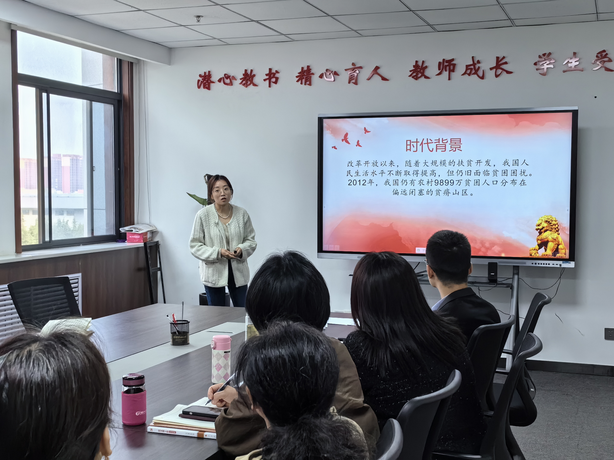 交流研讨环节,公共外语第一党支部聂晨同志围绕脱贫攻坚精神进行了专题报告,阐述了脱贫攻坚精神的丰富内涵和时代价值。