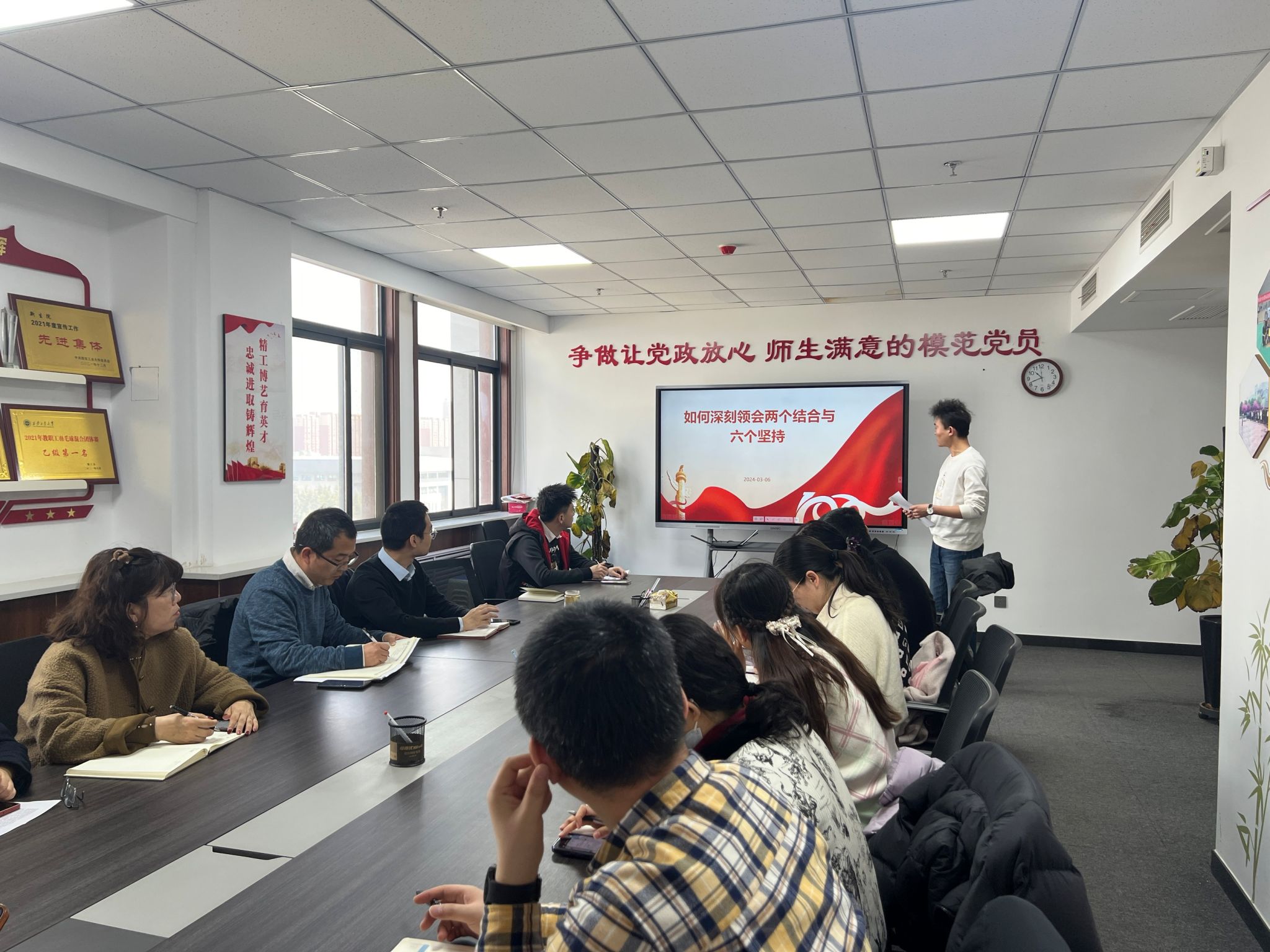 会议第二阶段为“一人一主题”学习交流。于杰从“两个结合”和“六个坚持”内涵出发,阐述了两者的关系与重要性,并结合自身学生工作经验分享了“两个结合”和“六个坚持”在高校教育中的应用和实践。