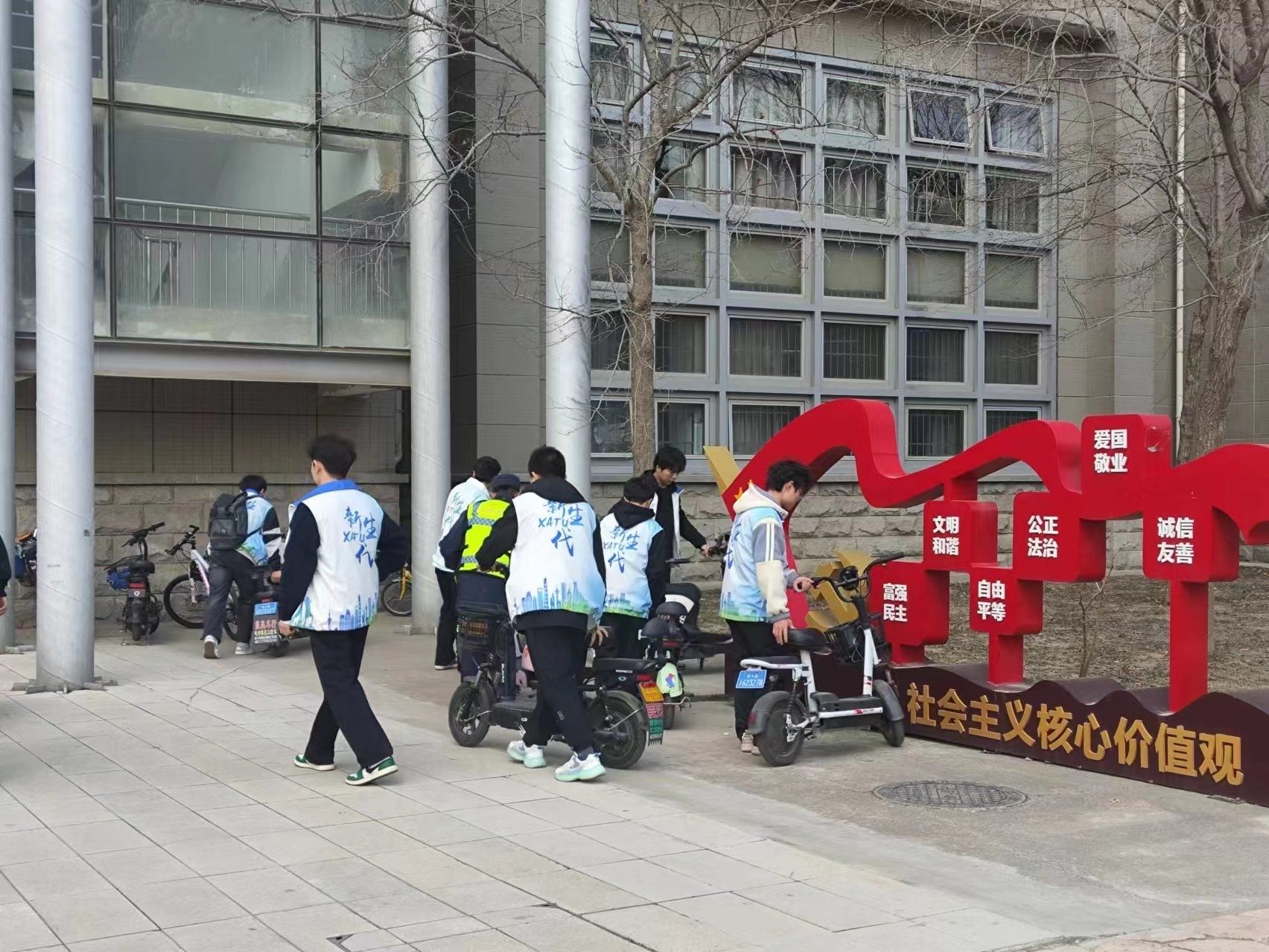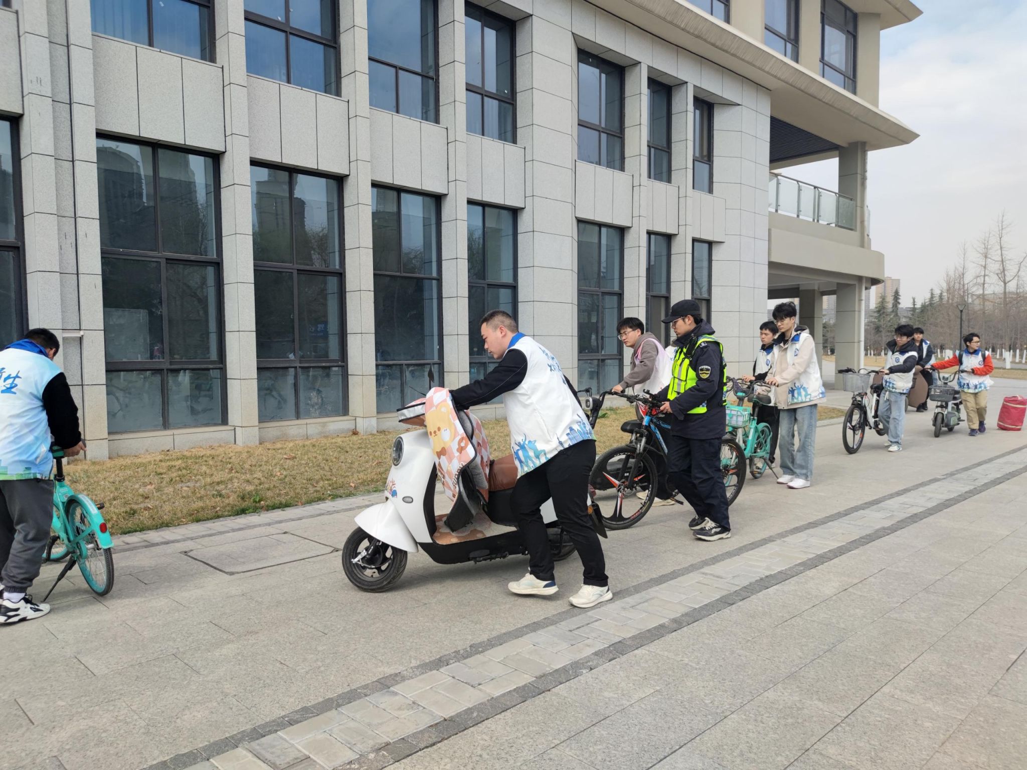 青年志愿者组成工作队在教学楼区域对随意停放的电动车、自行车进行挪移规整,对消防安全通道上的闲置车辆进行清除,确保消防通道安全无障碍。