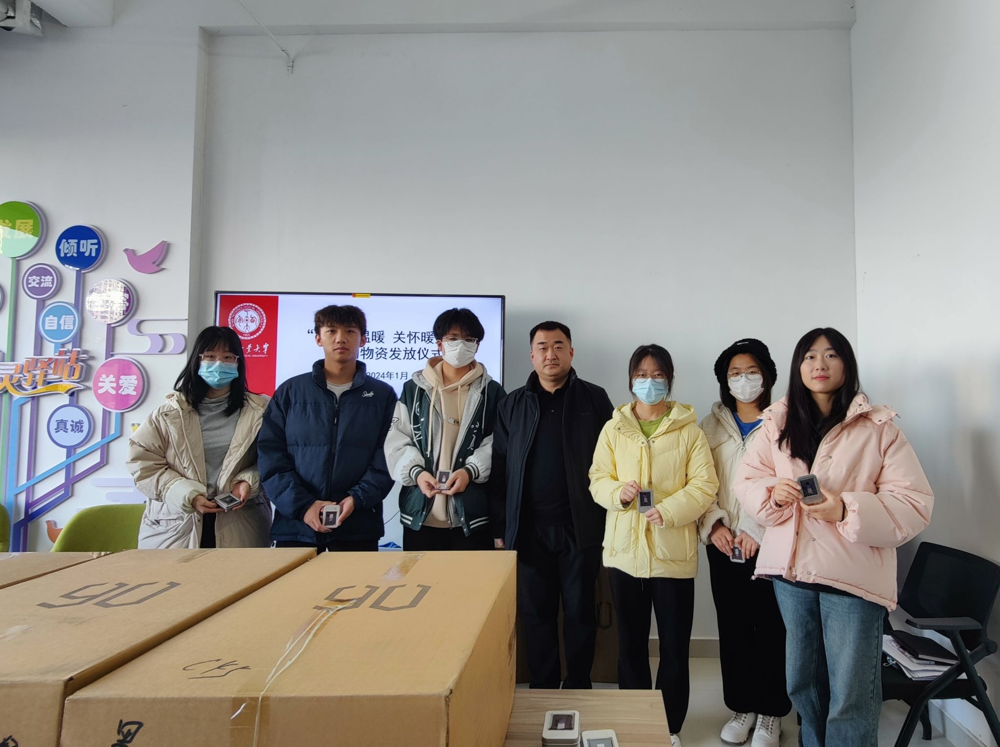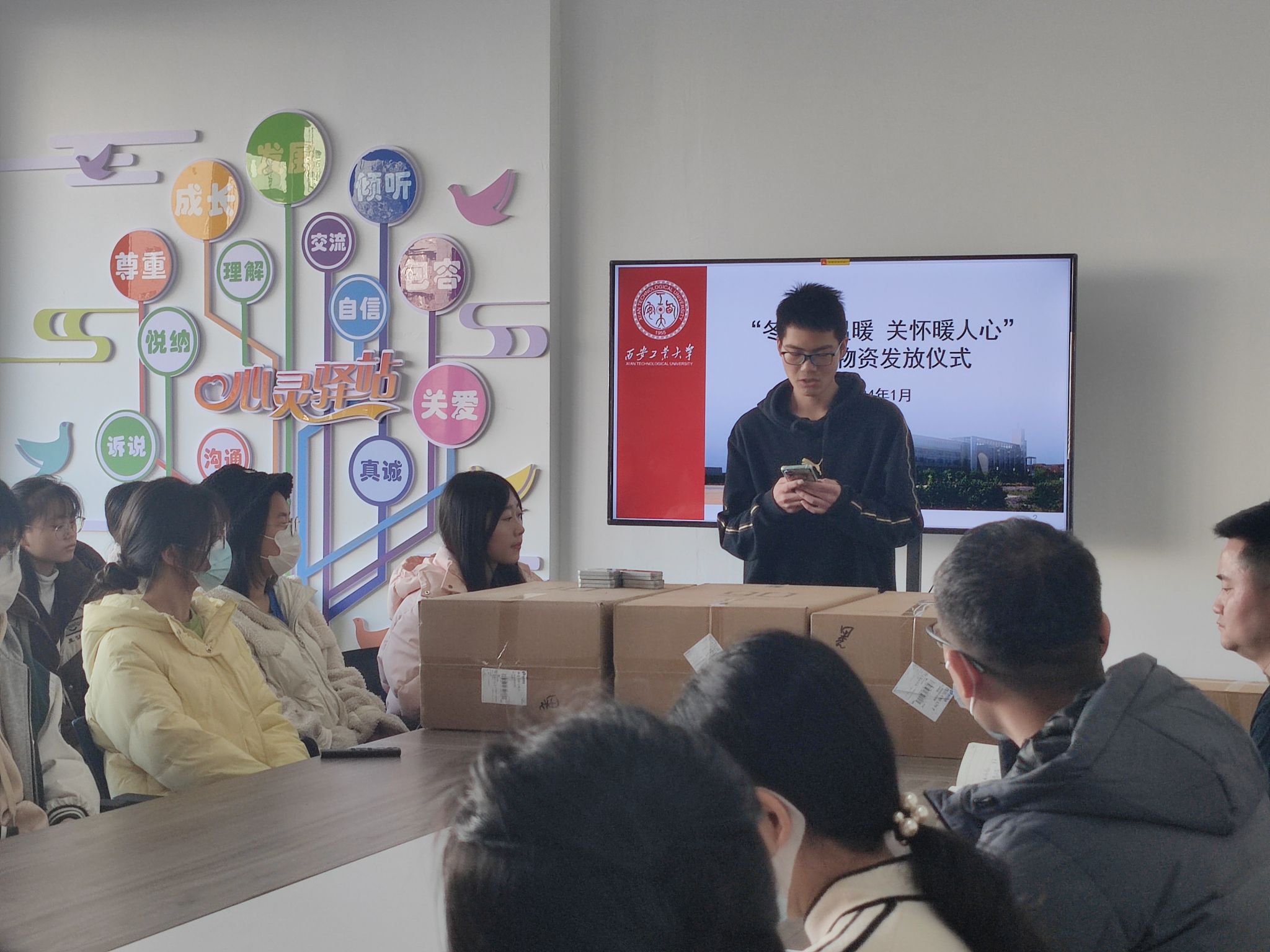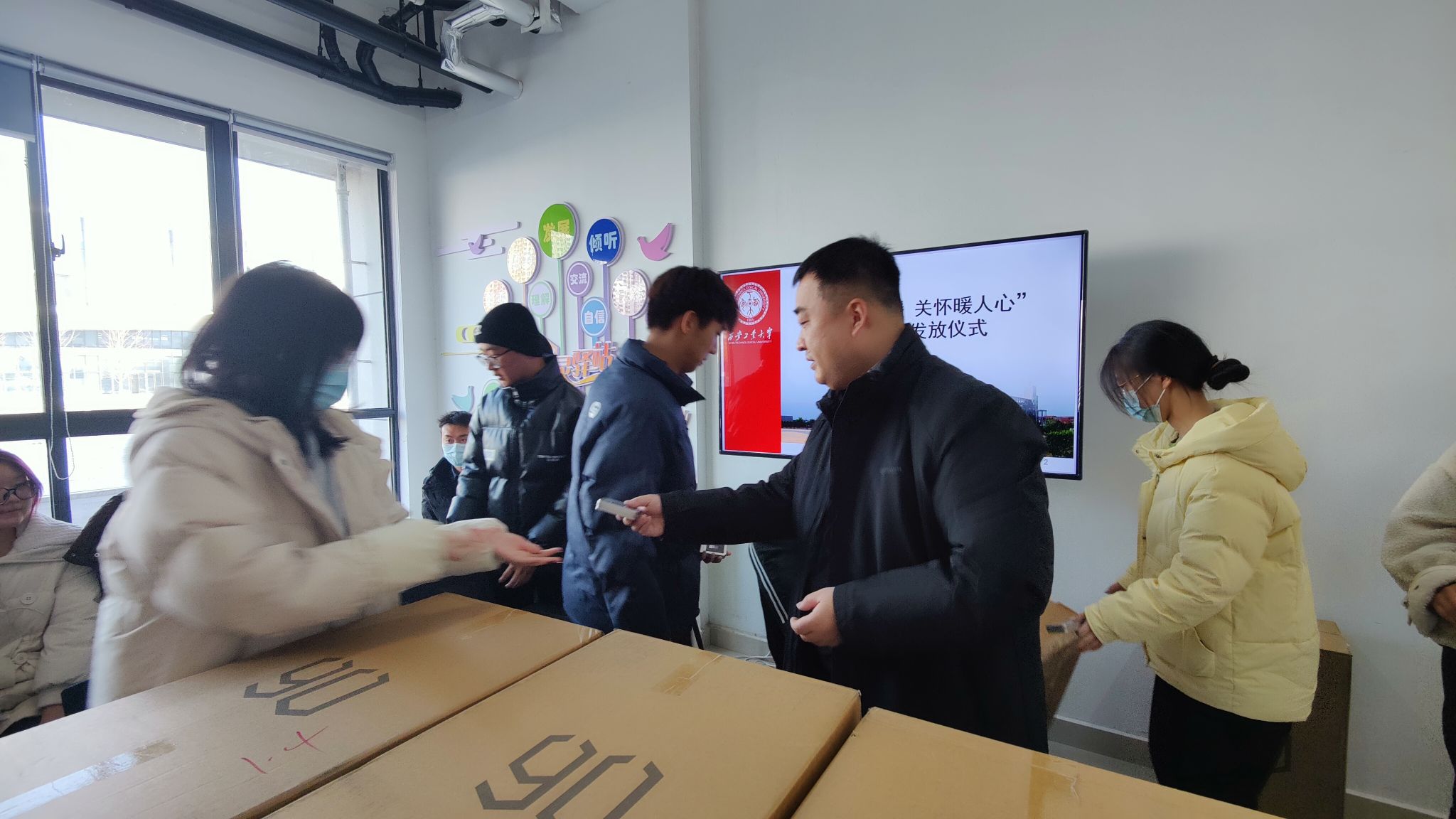 开展“冬日送温暖、关怀暖人心”资助物资发放仪式。学院党委副书记翟超、学院辅导员以及受助学生代表参加活动。