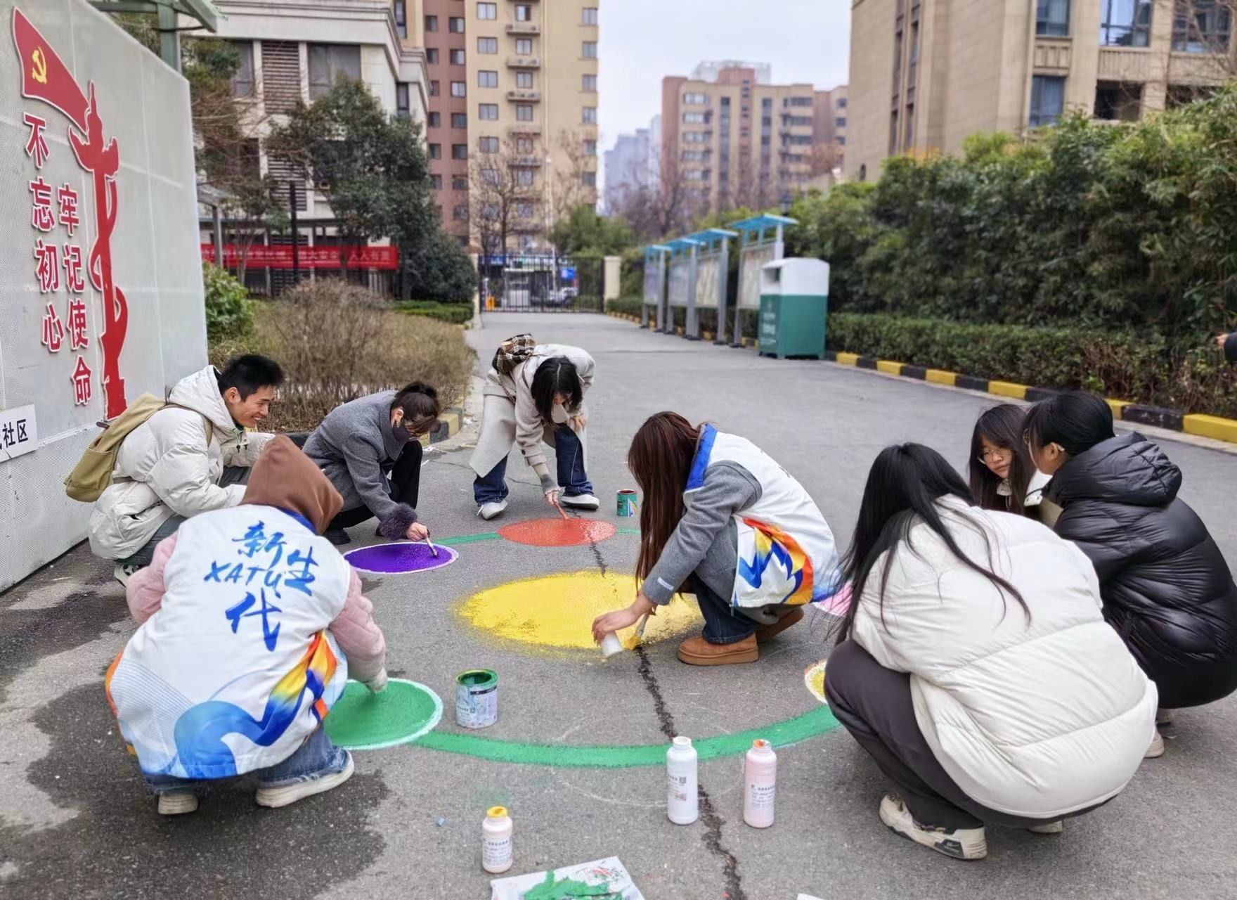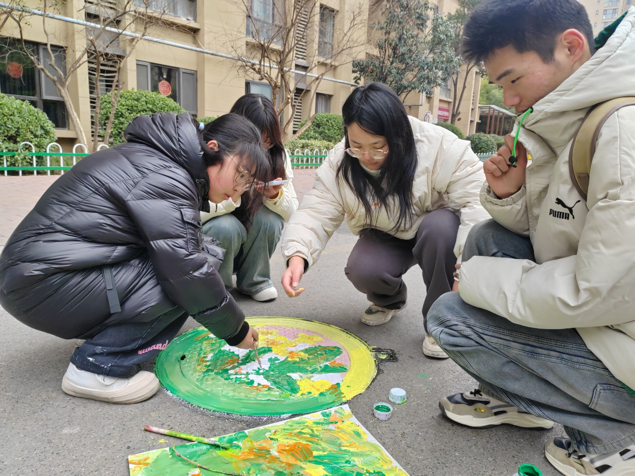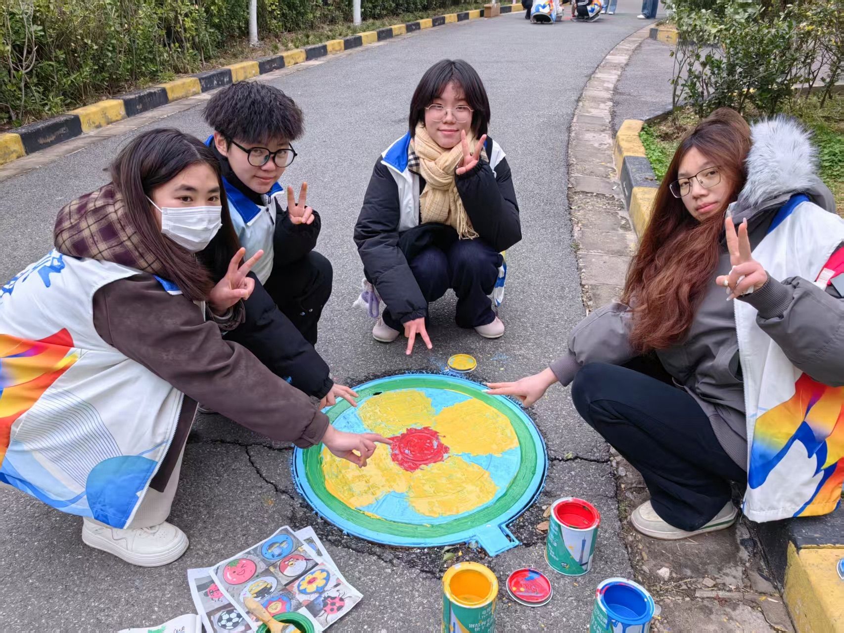 学子携手社区开展“井上添花”彩绘行动。来自永泰路小学的孩子们在志愿者指导下,将井盖变身成卡通主题的画布。这场跨龄共绘,既是美育启蒙课堂,更是精神传承仪式——当大学生的青葱笔触牵引着稚嫩小手涂鸦时,雷锋精神的种子也随之播撒。社区工作人员表示:“孩子们真的很有创造力和动手能力,这些‘宝藏井盖’不仅美化了社区环境,也点亮了居民的生活。”