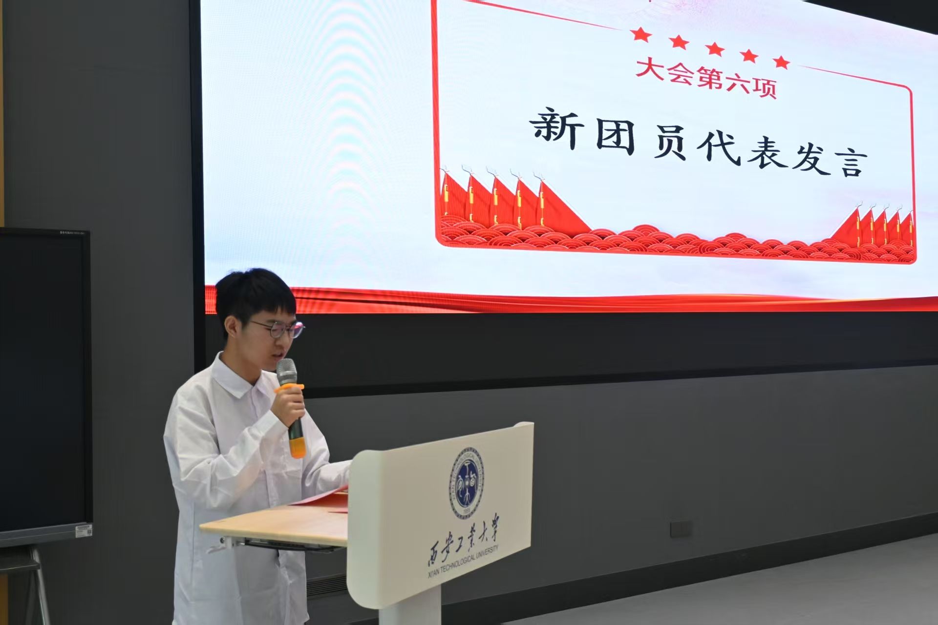 进取社区给排水科学与工程专业刘逸凡同学作为新团员代表发言。他表示,定当珍惜团员身份,不忘初心使命,以更加饱满的热情、更加务实的作风,努力成为一名有理想、敢担当、能吃苦、肯奋斗的新时代好青年。