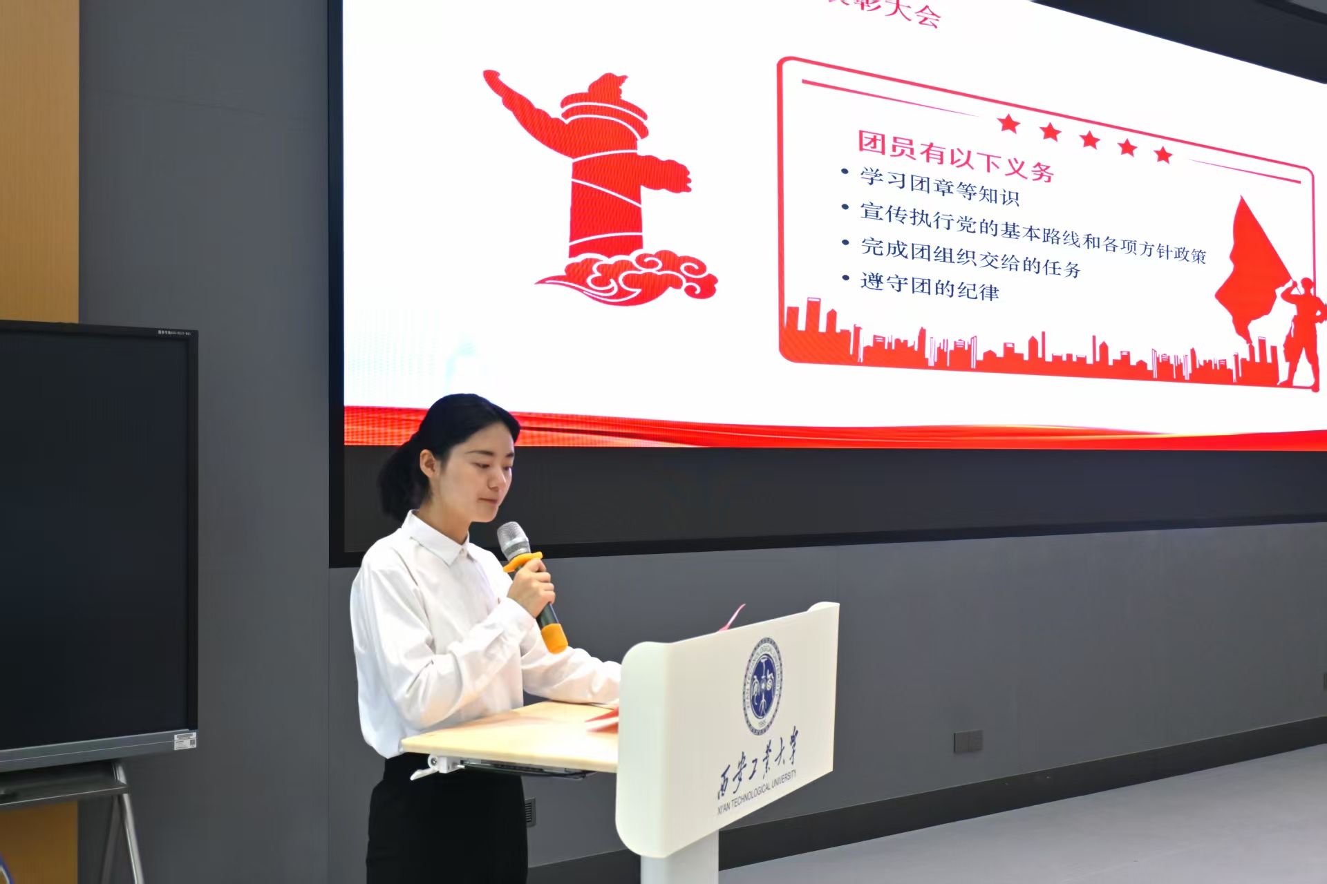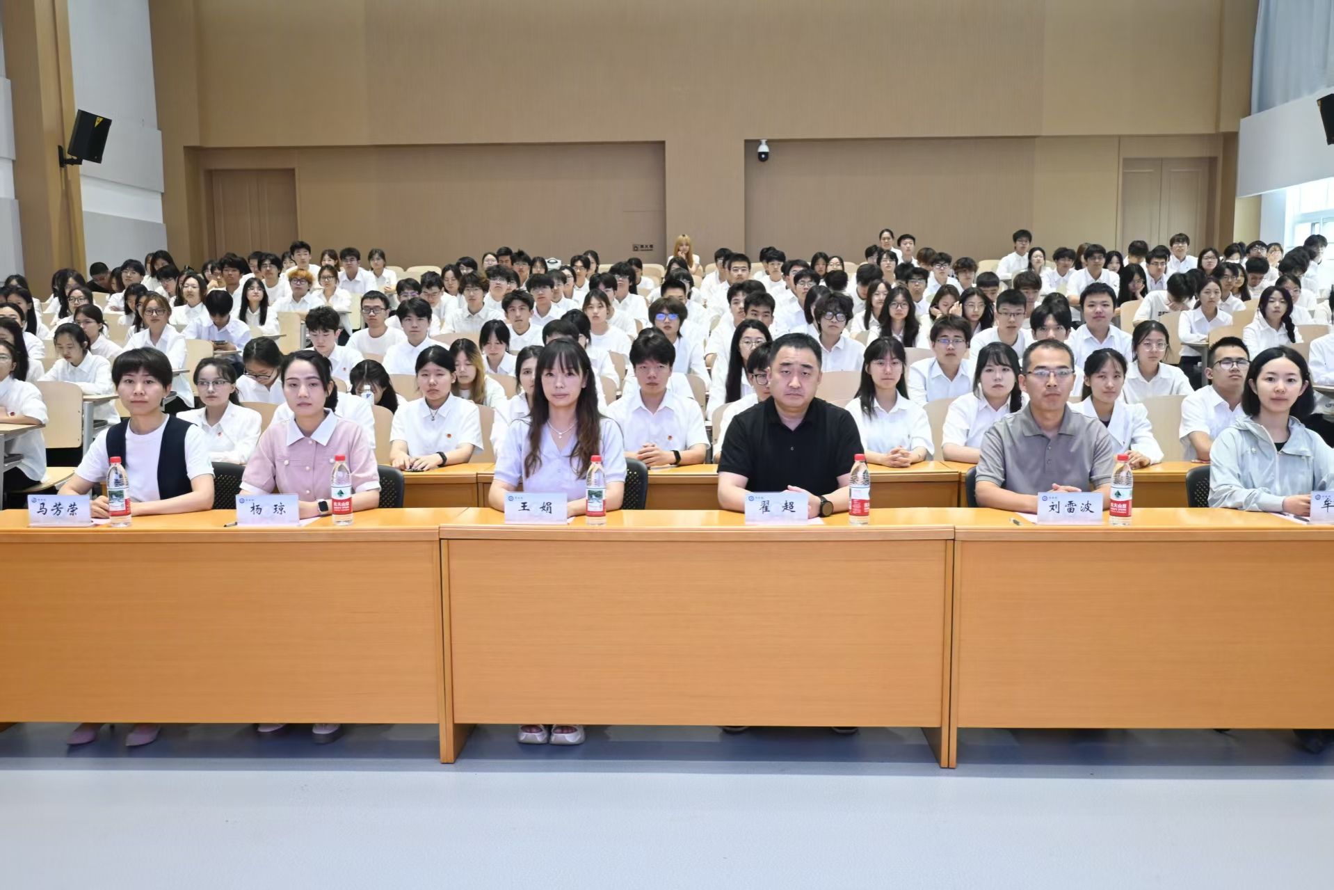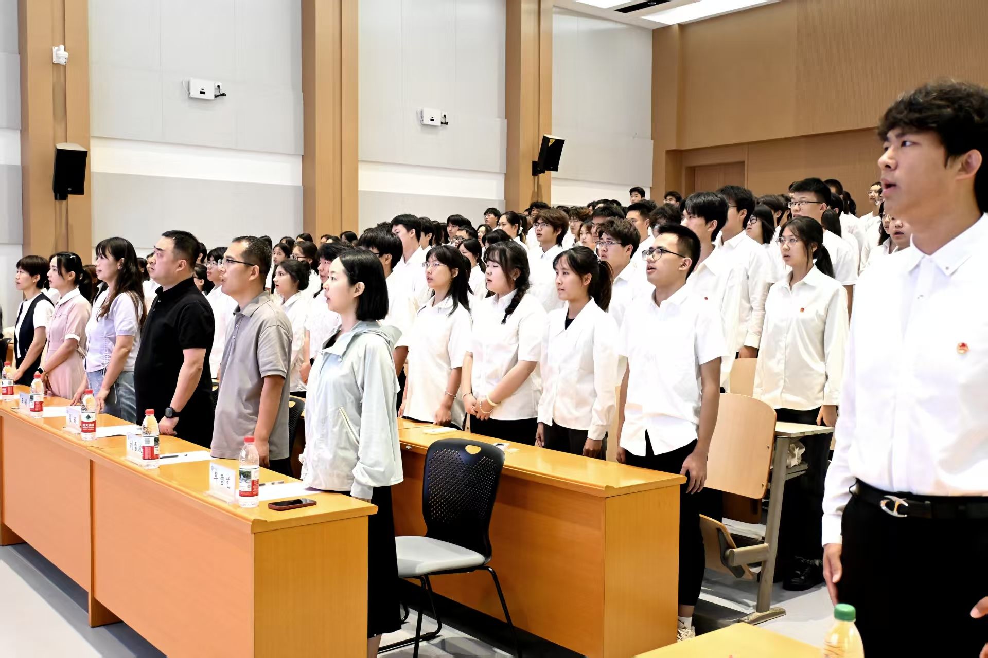 入团仪式在激昂的团歌声中拉开帷幕。院团委办公室负责人王敏慧宣读了新团员名单,老团员为新团员郑重佩戴团徽并庄严宣誓,201名同学光荣加入中国共产主义青年团。