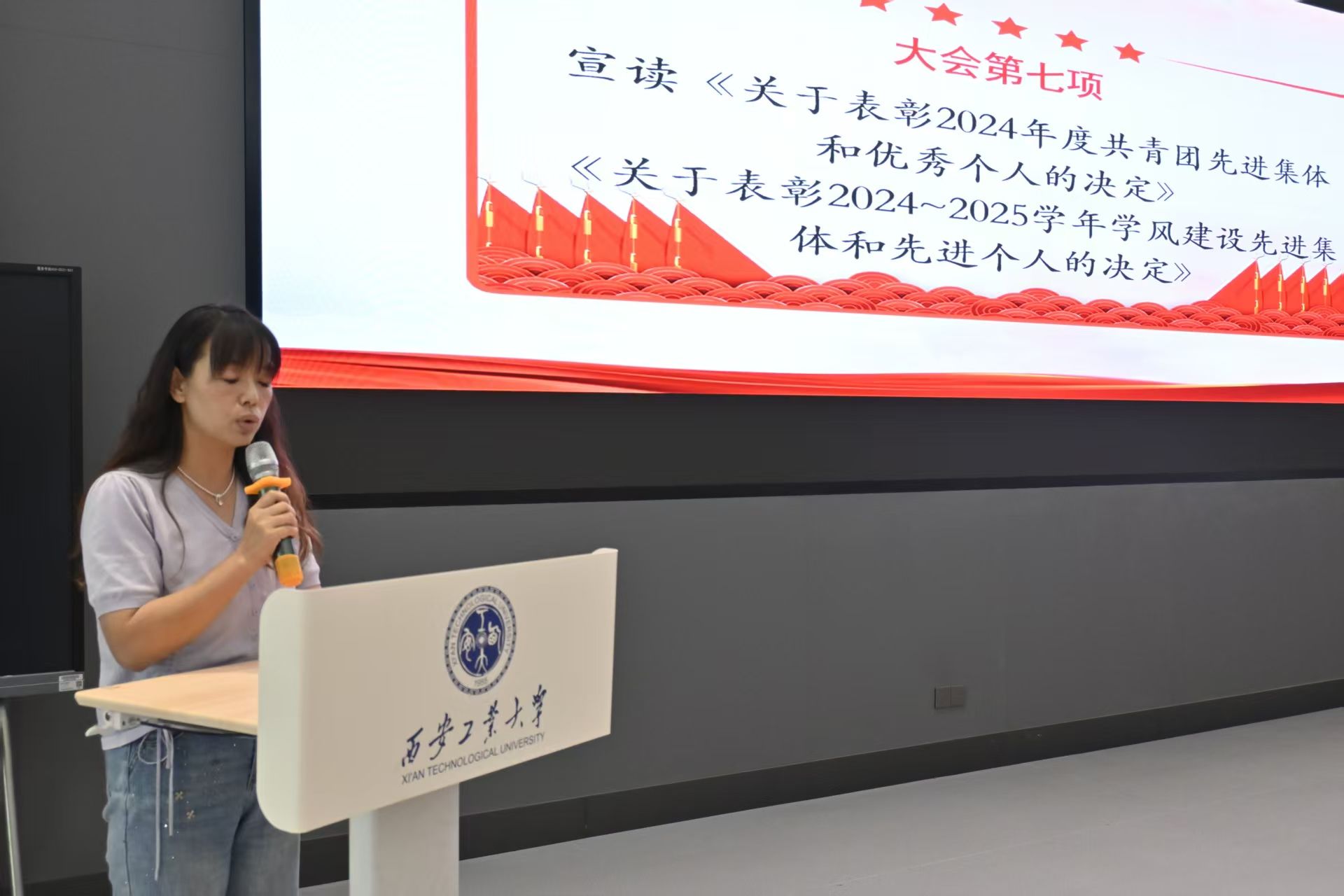 院学工办主任王娟宣读《关于表彰2024年度共青团先进集体和优秀个人的决定》《关于表彰2024-2025学年学风建设先进集体和先进个人的决定》。