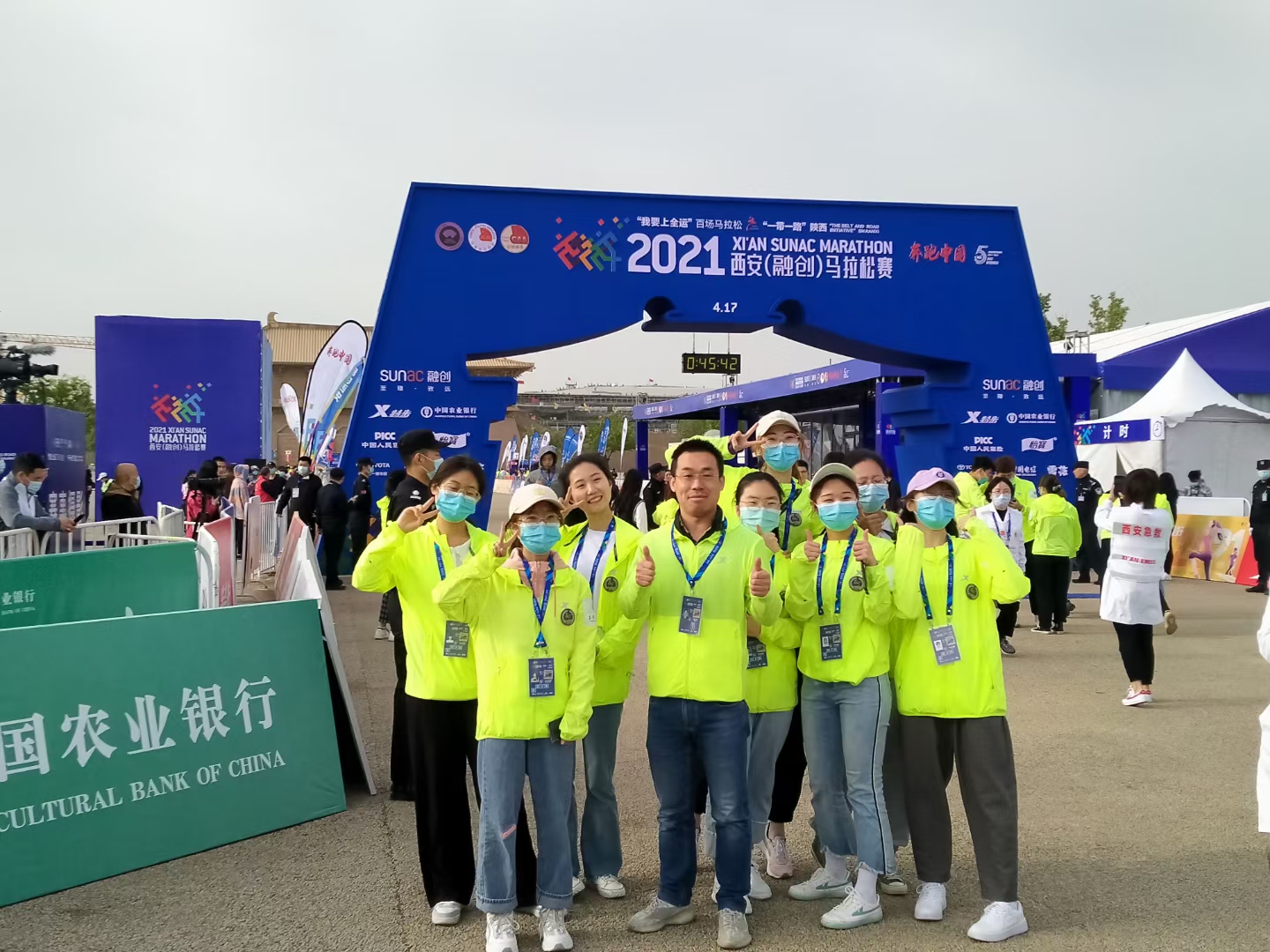 4月17日早上5点,西安还在睡梦之中,我们的志愿者同学却已早早起床,开始为今天的志愿服务工作做准备。早上7点30分,2021西安(融创)马拉松赛在永宁门正式发枪。54名同学在终点大明宫国家遗址公园分别进行男女前五名选手指引、登记完赛记录、奖牌发放、非正常完赛选手指引等工作,积极为完赛选手做好服务。