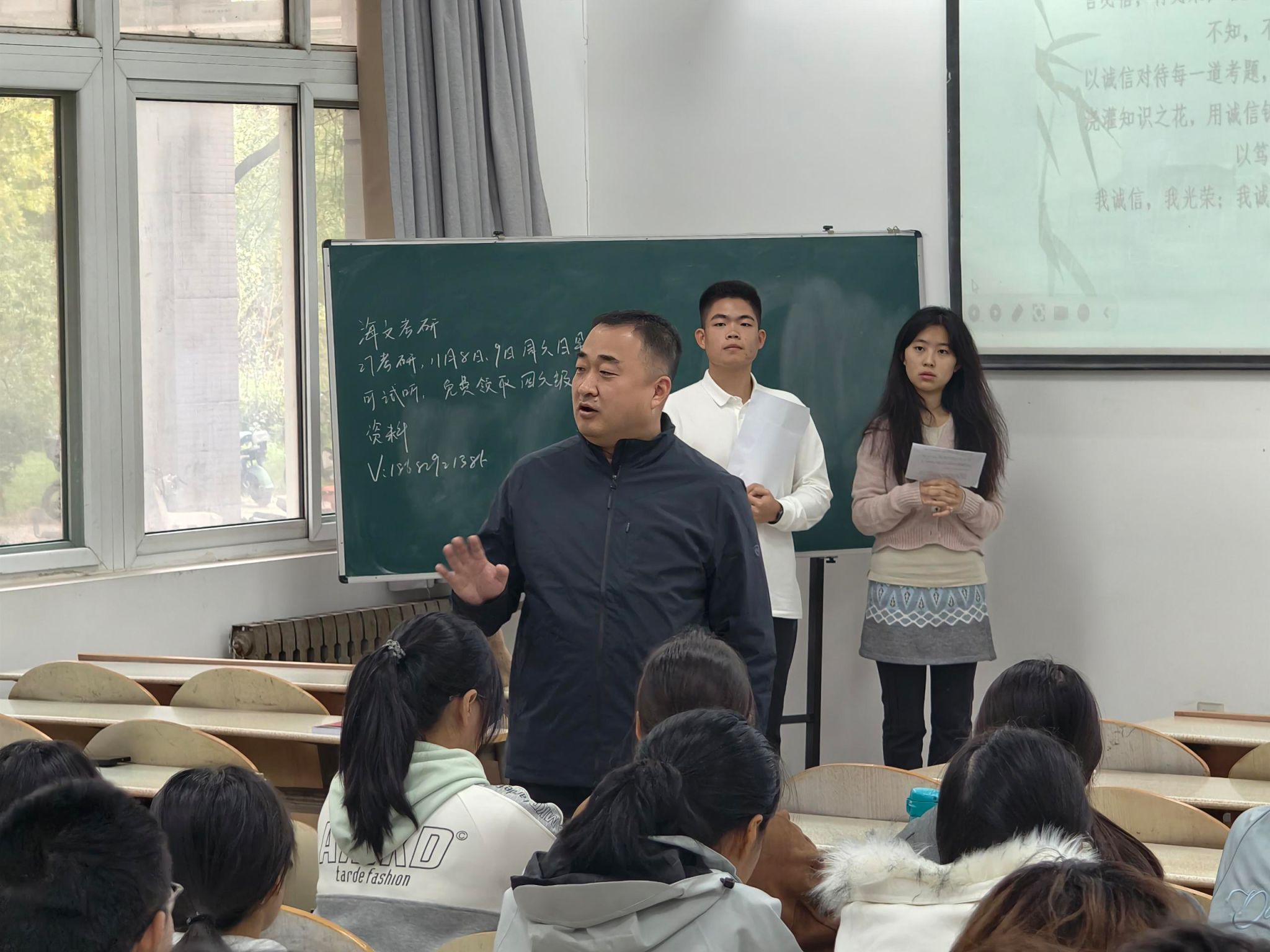 班会由唐钧腾、冯梓瑜同学主持,大家围绕“诚信应考”展开,张文博、李志英同学以“守诚于心,践信于行”进行主题演讲,班级学风联络员分享了备考建议,引导同学们“有备而考”,辅导员包佳良结合过往案例,强调考试纪律与相关规定,1-404宿舍全体成员表演了情景剧《考试前夕》,生动呈现同学们备考过程中的点滴困惑,如何诚信应考,慎重选择,引发共鸣。最后,全体同学签署诚信应考承诺书并庄严宣誓。