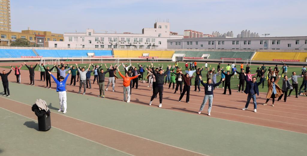 2021年11月15日中午12:40,初冬暖阳晴空碧,无码流出 工会组织全体老师参加“健康体魄,庆祝建党100周年”第九套广播体操活动。