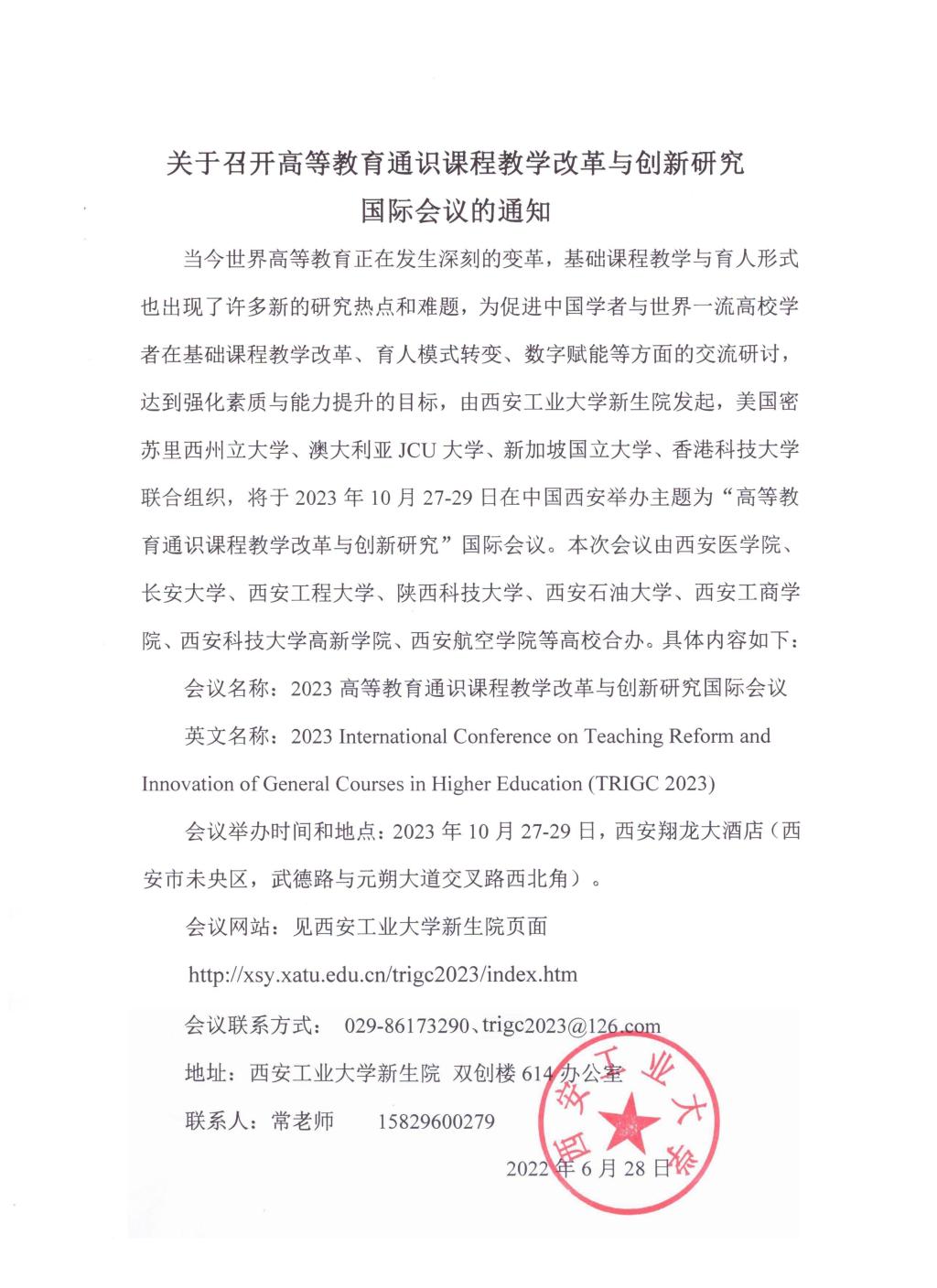 发起,美国密苏里西州立大学、澳大利亚JCU大学、新加坡国立大学、香港科技大学联合组织,将于2023年10月27-29日在中国西安举办主题为“高等教育通识课程教学改革与创新研究”国际会议。本次会议由西安医学院、长安大学、西安工程大学、陕西科技大学、西安石油大学、西安工商学院、西安科技大学高新学院、西安航空学院等高校协作合办。具体内容如下: