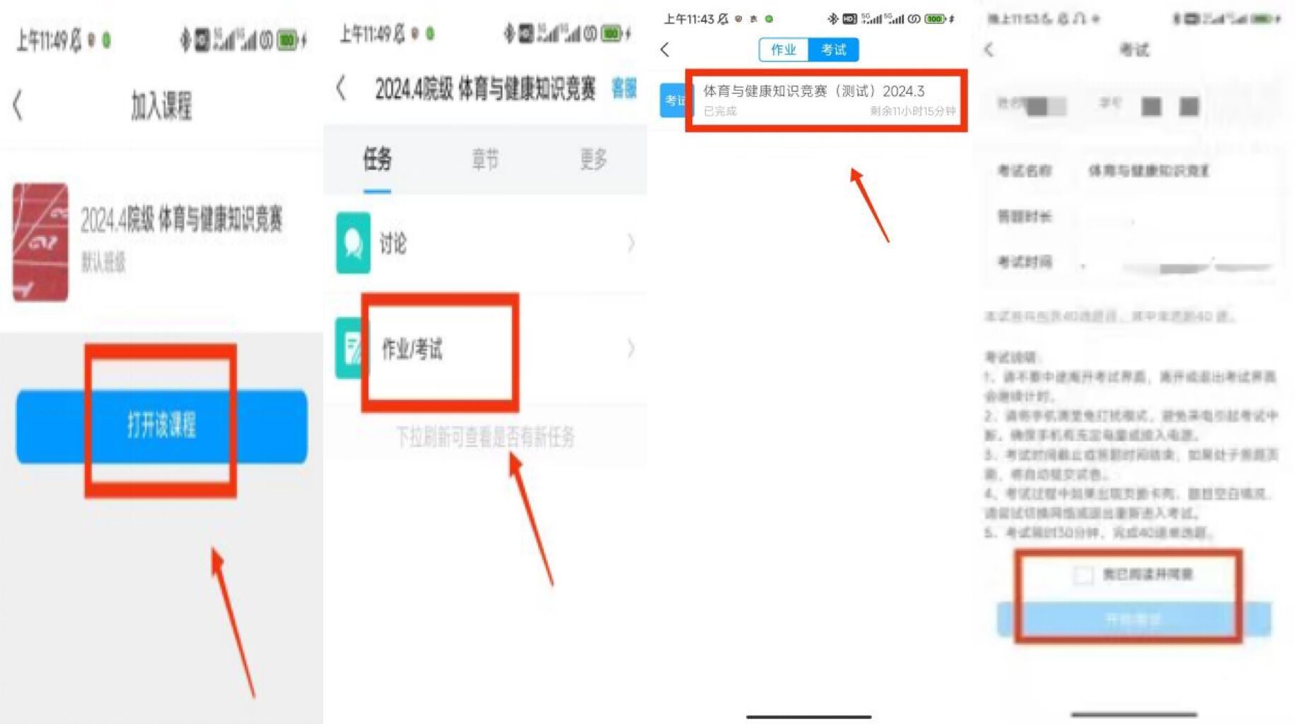 2、登录成功后,点击加入该课程→作业/考试→考试→体育与健康知识竞赛,即可答题。