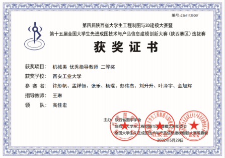 近日,“第四届陕西省大学生工程制图与3D 建模大赛暨第十五届全国大学生先进成图技术与产品信息建模创新大赛(陕西赛区)选拔赛”成绩揭晓。我校获得机械类团体二等奖,在陕西省参赛高校中名列第七,个人赛获得一等奖3项、二等奖12项、三等奖19项,获奖比例为85.36%,远高于全省获奖比例,获奖数量取得了历史性突破。