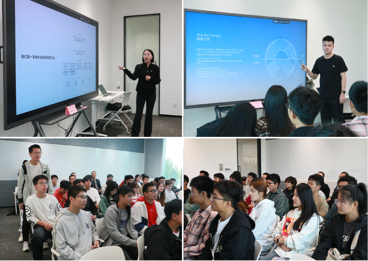 企业人力专员向同学们介绍了蔚来汽车的发展历程、产品系列、创新技术、展厅布置、人才培养及经营理念等内容。随后,大家参观了蔚来展厅、交付及售后区域,全方位地感受蔚来的运营模式和服务体系。