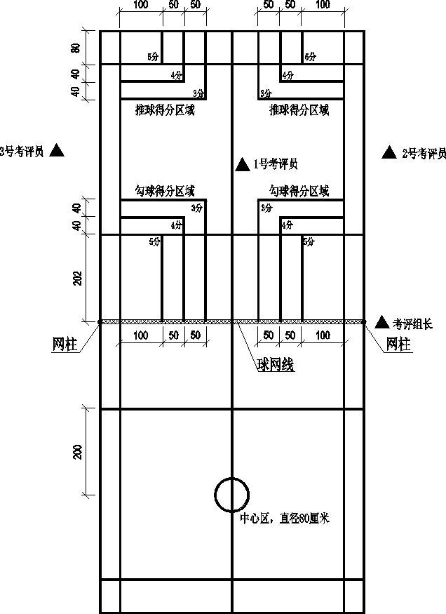 注:每次击球后必须回到中心区(至少一只脚踏入中心区),否则判为违例。每违例一次扣 2 分,当次击球有效。