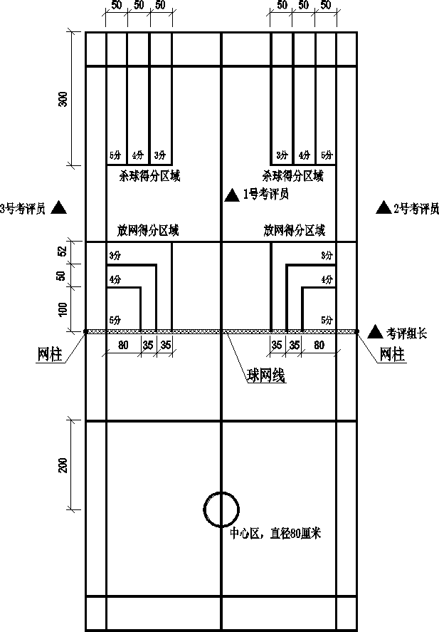 一、测试者位于待考区。教师示意后,测试者进入测试区域,面向球网双脚站立在中心区内。