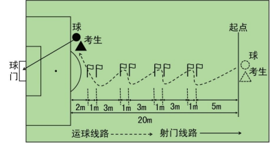考试方法:如下图所示,从罚球区线中点垂直向场内延伸至 20 米处,画一条平行于球门线的横线作为起点线。距罚球区线 2 米处起,沿 20 米垂线共插置 8 根标志杆。考生将球置于起点线上,运球依次绕过 8 根标志杆后起脚射门,球动开表,当球从空中或地面越过球门线时停表,记录完成的时间。凡出现漏杆、射门偏出球门,球击中横梁或立柱弹出,均属无效,不计成绩。每人测试2次,取最好成绩。