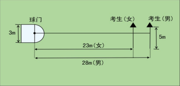 考试方法:如下图所示,传球目标区域由一个室内五人制足球门(球门净宽度3 米,净高度 2 米)和以球门线为直径(3 米)画的半圆组成,圆心(球门线中心点)至起点线垂直距离为男子28 米,女子 23 米。考生须将球置于起点线上或线后(线长 5 米,宽 0.1米),向目标区域连续传球5次,左右脚均可,脚法不限。
